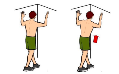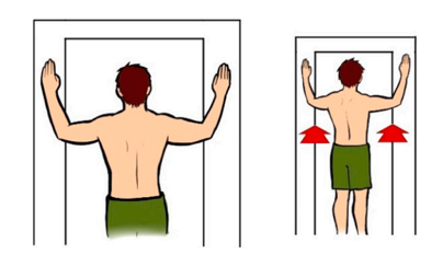 Faça o alongamento dos peitorais com auxílio de um canto ou uma porta com braço de alavanca curto e longo no tempo expiratório